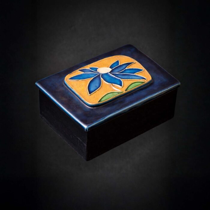 Élégante boîte en céramique émaillée signée Mithé Espelt, artiste emblématique de l’atelier d’Uzès, reconnue pour ses créations décoratives aux motifs stylisés et à la palette raffinée.