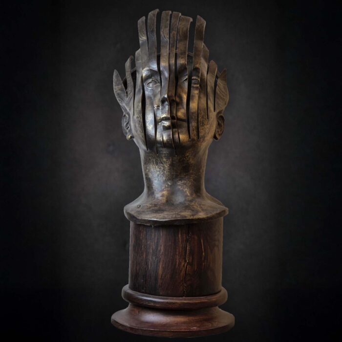 Sculpture en bronze signée René Hetzel, représentant un buste masculin traité dans une approche résolument contemporaine et expressive.