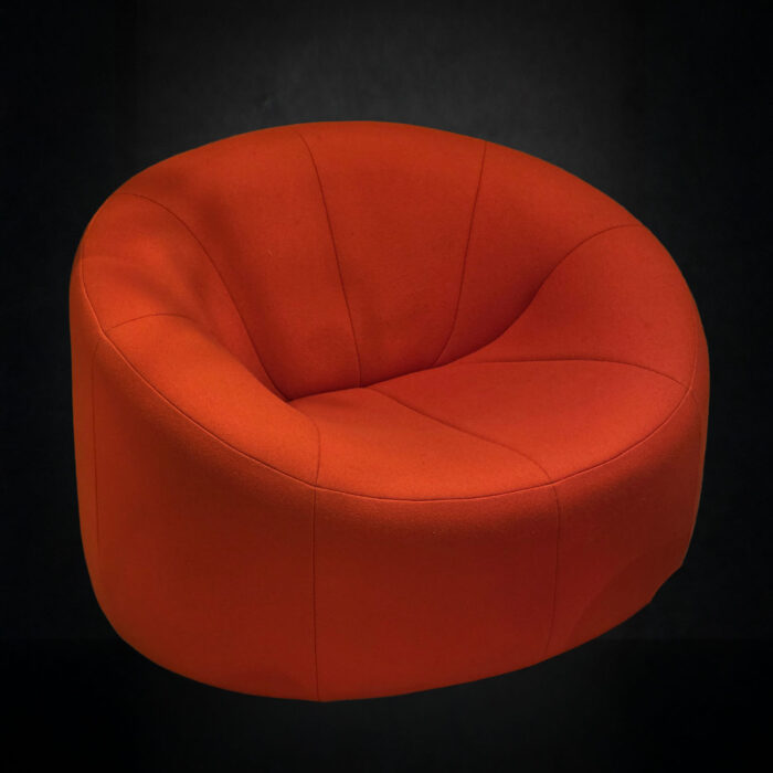 Superbe ensemble composé d’un fauteuil lounge et de son repose-pied attribué à Pierre Paulin, figure majeure du design français du XXe siècle.