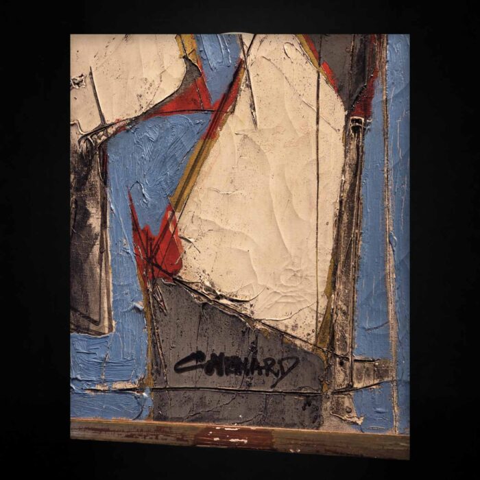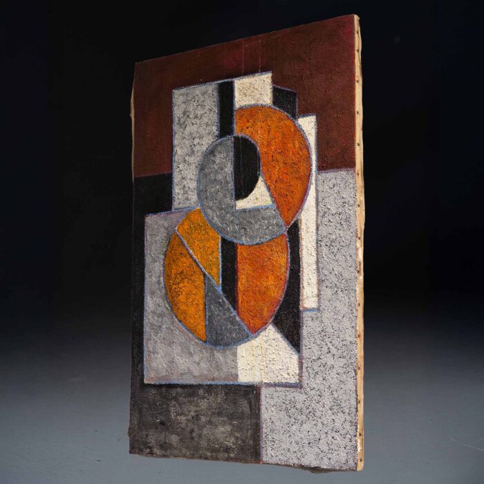 Intéressante huile sur toile signée Gilbert Thévenot, s’inscrivant dans une recherche plastique influencée par les courants constructivistes et le cubisme tardif d’après-guerre.