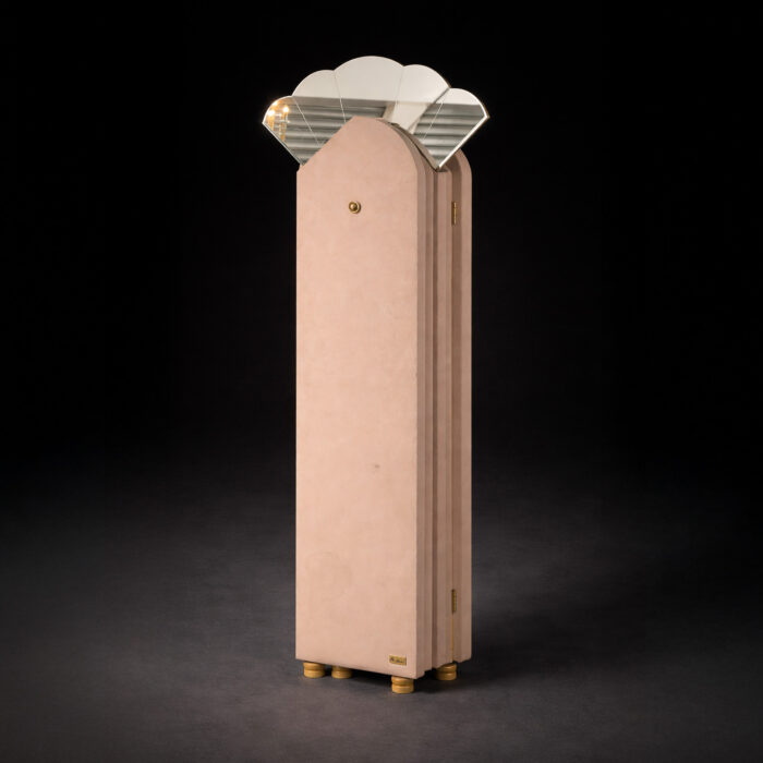 Élégant miroir triptyque attribué à la prestigieuse Maison Jansen, réalisé dans les années 1970, dans un esprit résolument Hollywood Regency mêlé à des influences Art Déco …