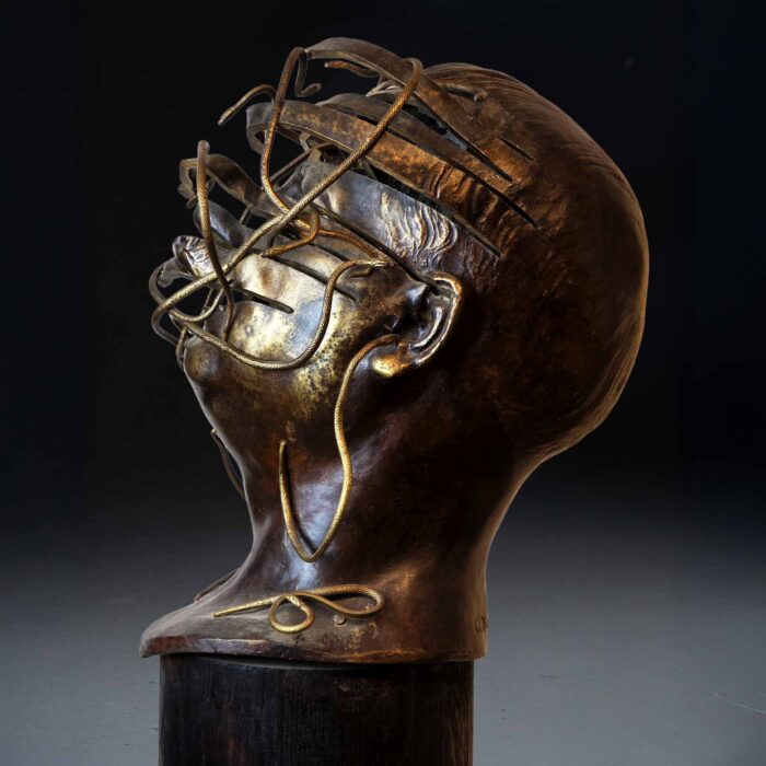 Sculpture saisissante signée René Hetzel, représentant un buste masculin fragmenté, traversé et enserré par un entrelacs de serpents en bronze.