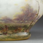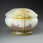 Cette élégante boîte à bijoux en verre givré, à décor émaillé et doré, est une superbe création de la manufacture Daum Nancy, emblématique de l’Art nouveau français. Sur sa surface douce et satinée se déploie un délicat paysage champêtre : des arbres élancés aux feuillages dorés se détachent sur un horizon pastel, baigné de lumière diffuse. L’ensemble évoque la poésie naturaliste si chère à la maison Daum, où la nature devient une source d’inspiration inépuisable.