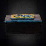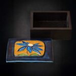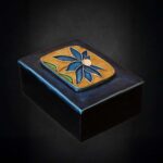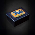 Cette pièce se distingue par son couvercle orné d’un décor en relief représentant une fleur de tiaré, traité dans des tonalités profondes de bleu, rehaussées d’un fond craquelé doré caractéristique du travail de l’artiste. L’ensemble est encadré par un émail bleu intense, créant un contraste riche et lumineux.
