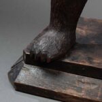 La force et la douceur de l’animal sont rendues avec une remarquable précision : chaque détail du pelage est finement ciselé, tandis que l’expression du museau et le modelé du corps témoignent d’un grand savoir-faire artisanal. La riche patine brune souligne la profondeur du bois et confère à l’ensemble un charme authentique et chaleureux.