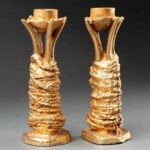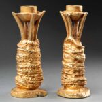 Cette remarquable paire de bougeoirs en fonte d’aluminium doré est une création de Pierre Casenove pour la maison Fondica, éditée dans les années 1990. Véritables sculptures à part entière, ces pièces se distinguent par leurs formes organiques et leur texture brute, qui évoquent à la fois la nature et la main du sculpteur.