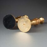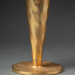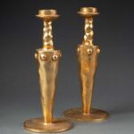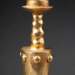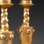 Cette paire de chandeliers en bronze doré séduit par la vigueur de sa silhouette et la richesse de sa patine. Le fût, rythmé par un martelage régulier et ponctué de clous hémisphériques, évoque une esthétique à la fois archaïque et moderniste. Chaque détail témoigne d’un travail artisanal attentif, où la matière brute se transforme en sculpture lumineuse.