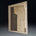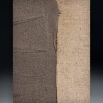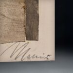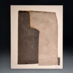 Cette composition minimaliste se distingue par l’utilisation de fragments de toile brute et de matières textiles appliqués sur support, créant un jeu subtil entre surfaces, textures et nuances. Deux grandes zones dialoguent : une partie sombre, dense et travaillée, contrastant avec une toile claire laissée presque à l’état brut, aux bords volontairement irréguliers.