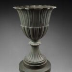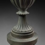 Imposant vase Médicis en bronze patiné, reposant sur une élégante colonne Art déco cannelée à spirale. L’ensemble séduit par l’équilibre entre la rigueur architecturale du piédestal et la douceur des formes galbées du vase, dont les godrons verticaux captent subtilement la lumière.